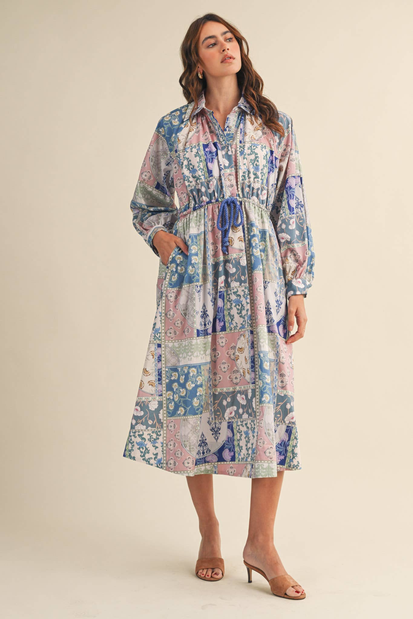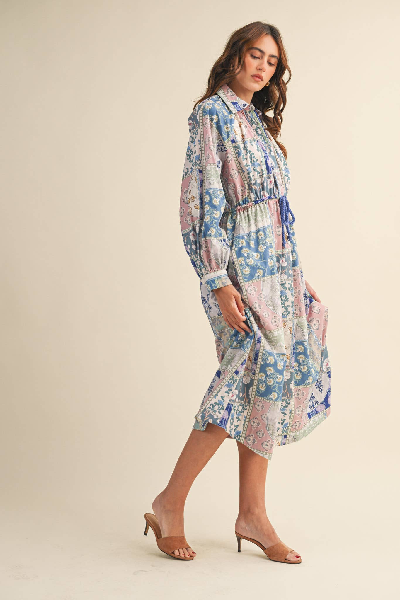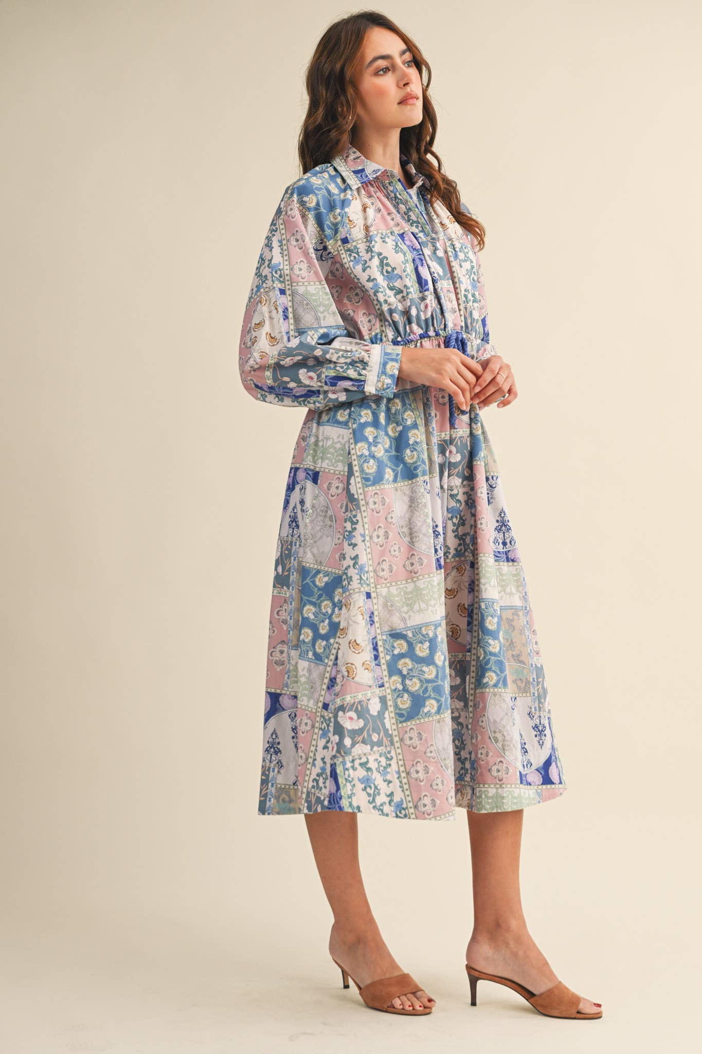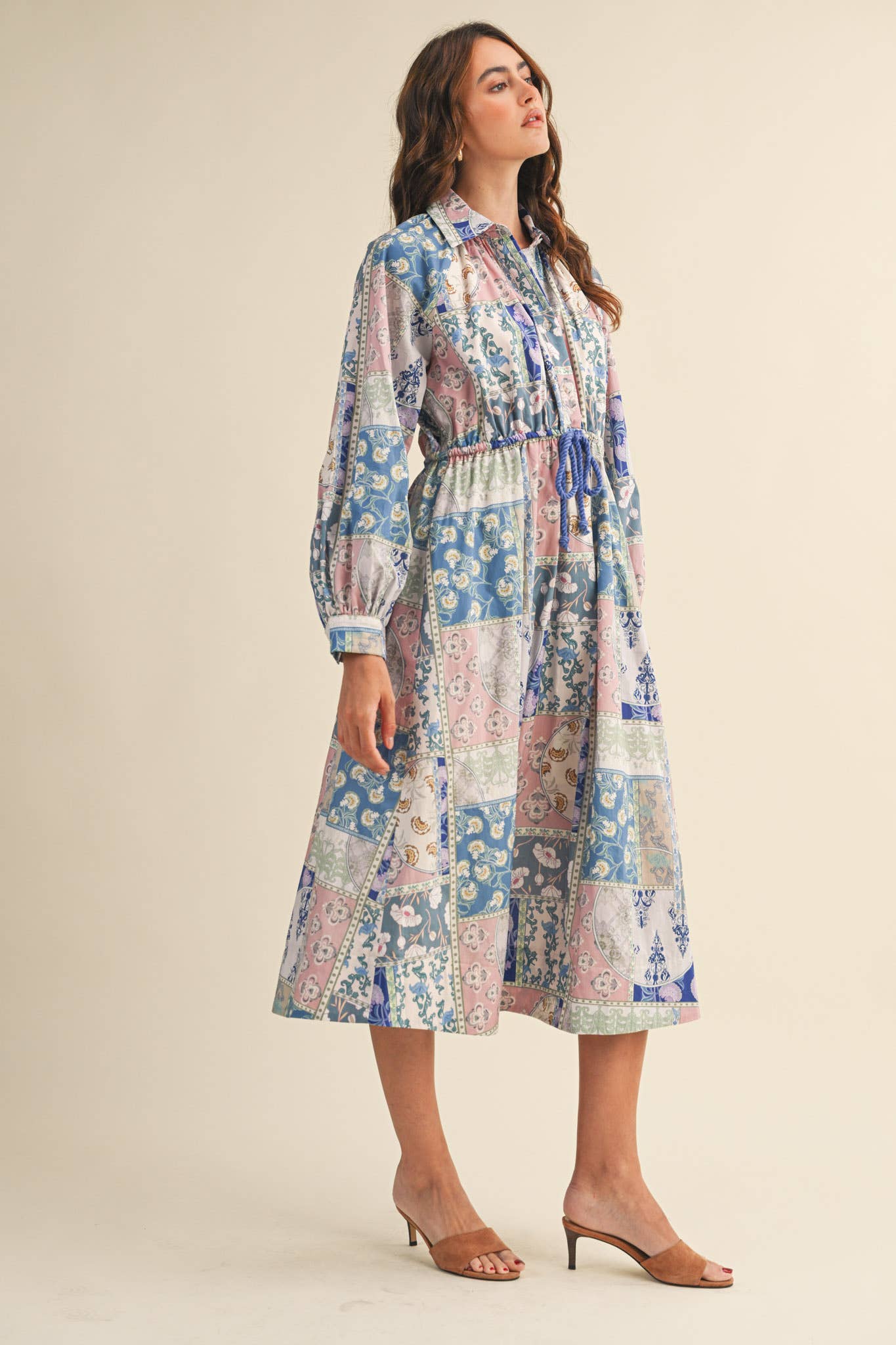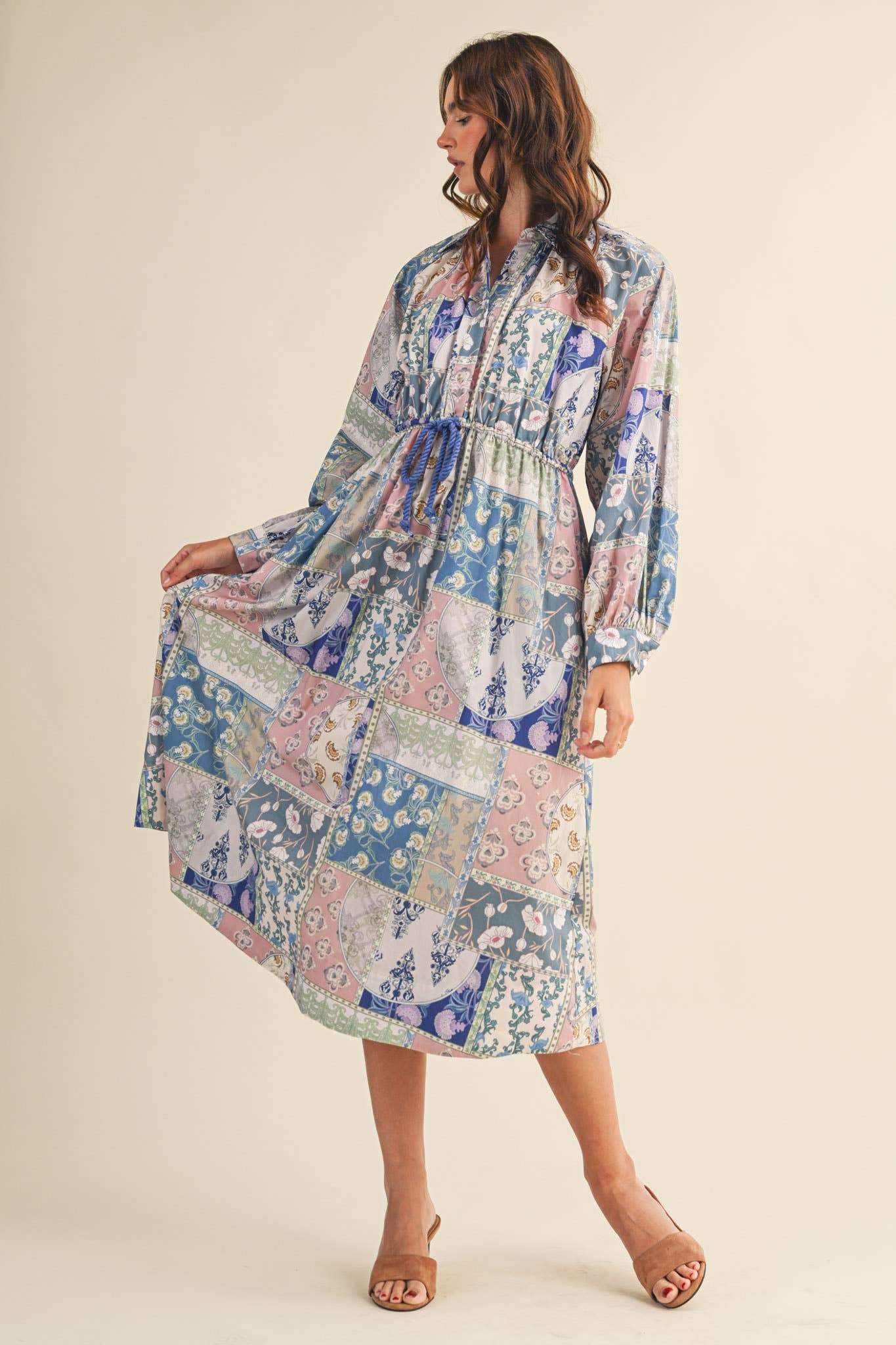 + Floral patchwork drawstring waist midi dress