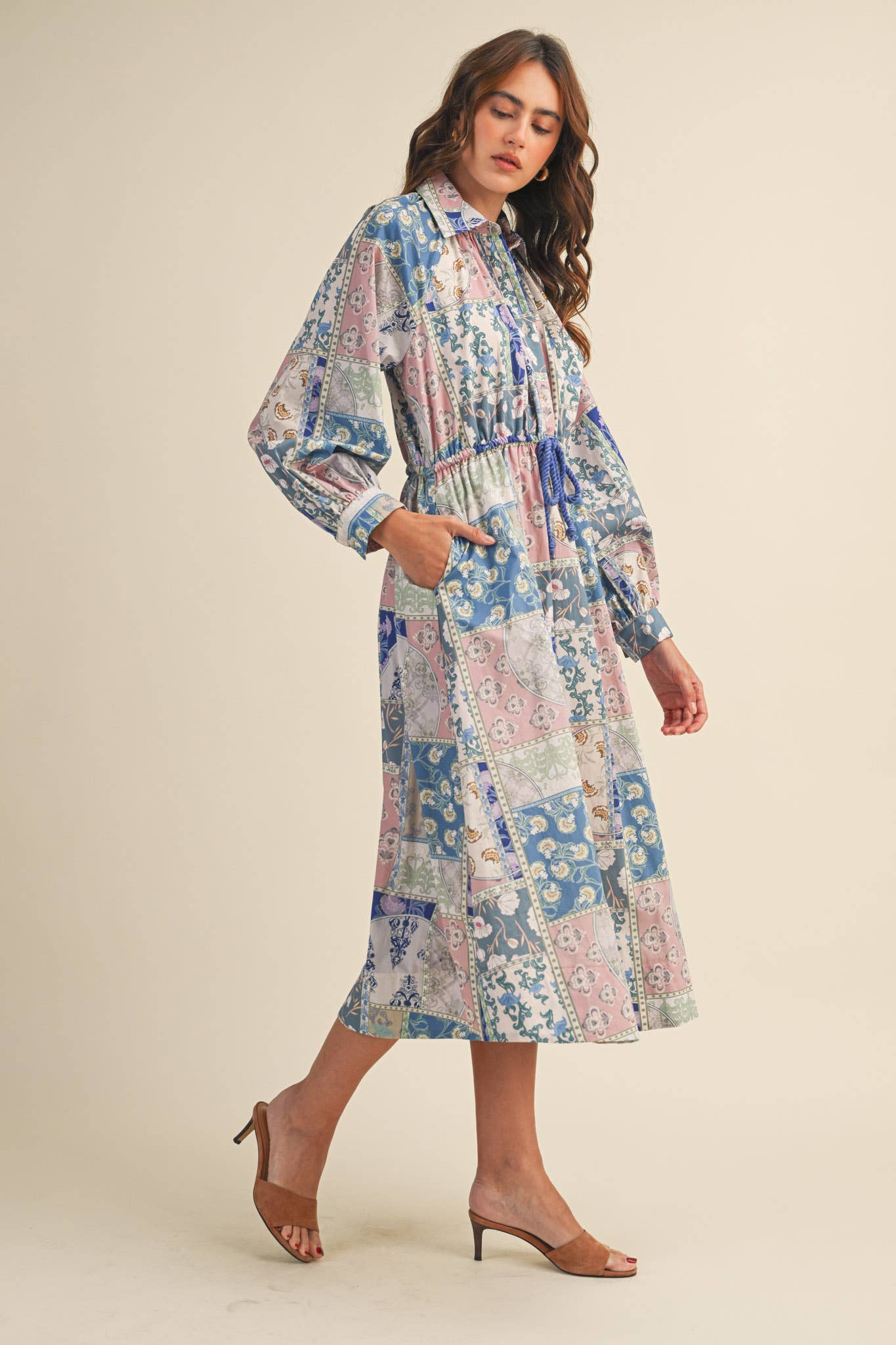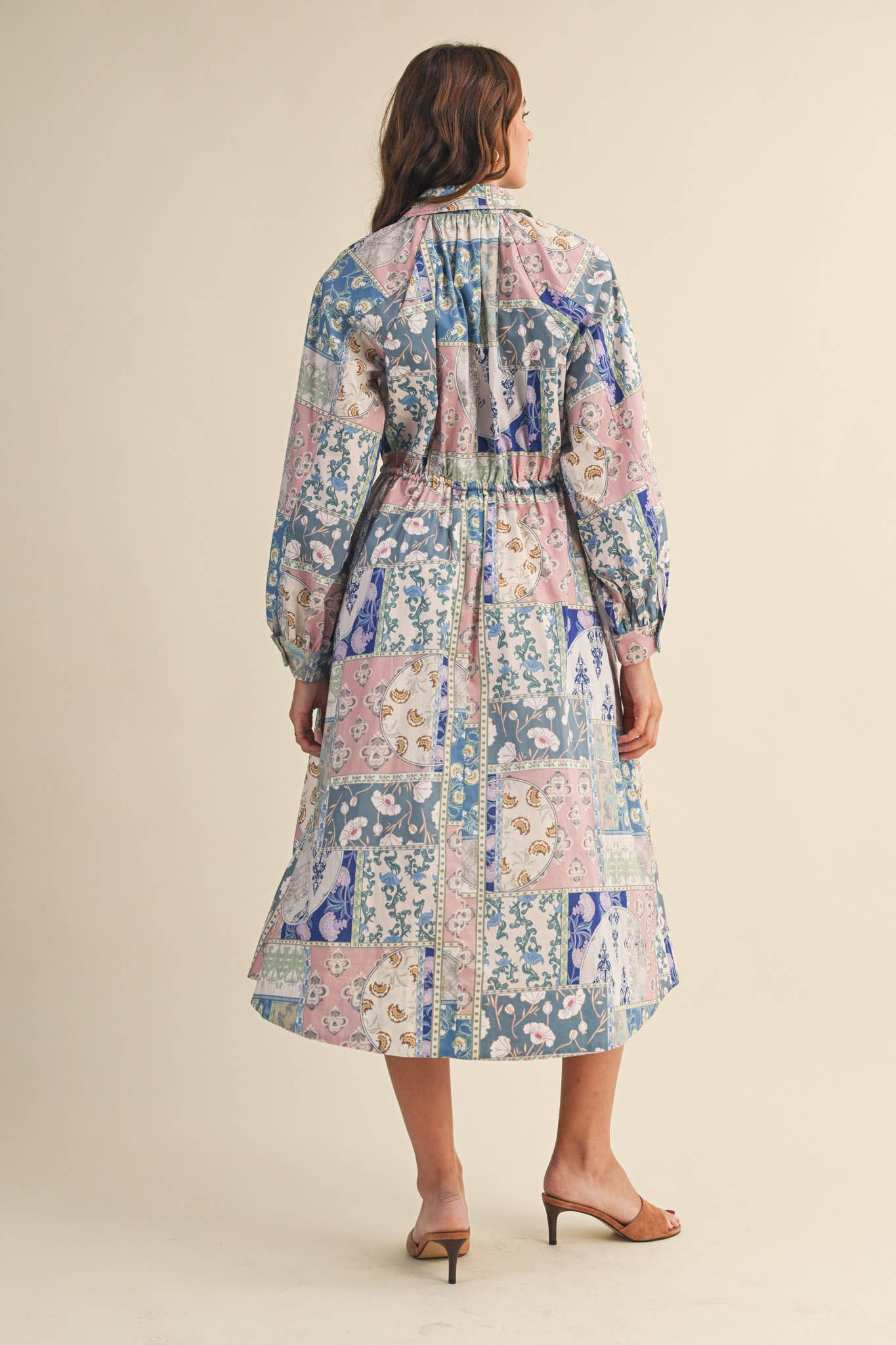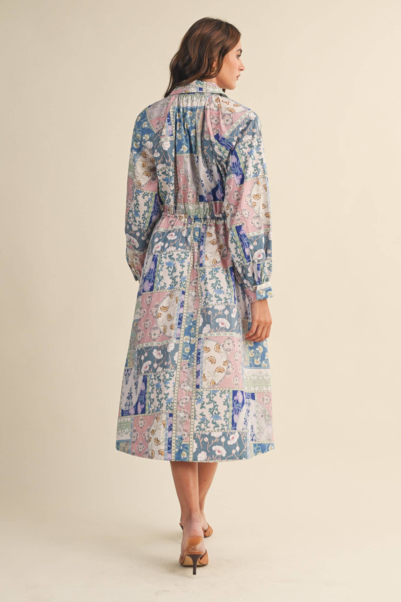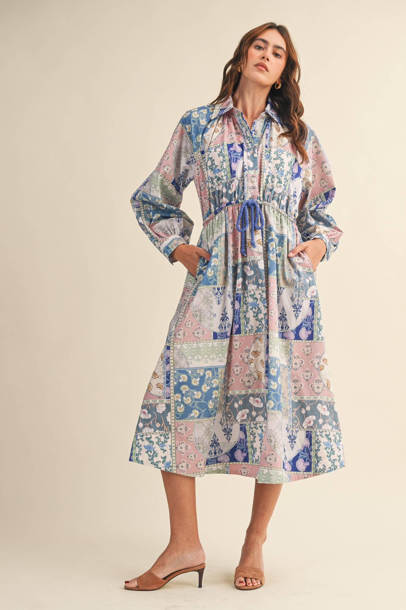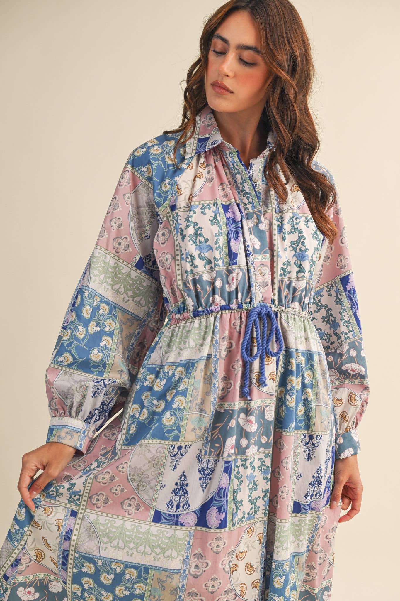 + Floral patchwork drawstring waist midi dress